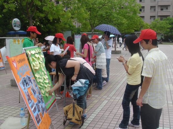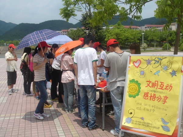 5月7日,東湖食堂門口一張貼滿照片的展板前圍滿了同學,校青協(xié)文明禮儀部 “文明互動,感悟分享”活動在此開展。