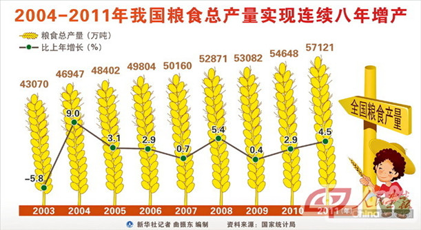 黨的十六大以來的十年,是中國農業農村發生歷史性巨變、農民得實惠最多的時期之一。中共中央一號文件連續9年關注三農,徹底取消了農業稅,堅定不移走中國特色農業現代化道路,加快推進社會主義新農村建設。農業綜合生產能力不斷提高,糧食產量實現歷史性的“八連增”,糧食儲備超過5000億斤,是歷史最高水平。農業農村發展的好形勢,為國家戰勝各種風險挑戰奠定了堅實基礎,為促進國民經濟平穩較快發展提供了有力支撐。