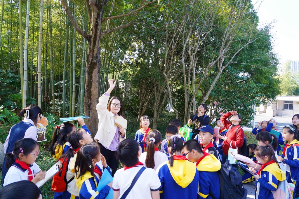 2024年11月3日,杭州,一批小學(xué)生在浙江農(nóng)林大學(xué)東湖校區(qū)的校園里開展生態(tài)主題研學(xué)活動,在志愿者指導(dǎo)下學(xué)習(xí)辨認(rèn)各種植物的形狀及特征。浙江農(nóng)林大學(xué)是國家生態(tài)文明教育基地,校園里種植有各種植物種類近3500種,已經(jīng)成為周邊大中小學(xué)生開展生態(tài)主題研學(xué)、學(xué)習(xí)植物知識的重要基地。