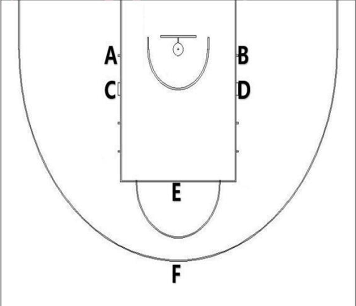 3.規則:比賽前,現場抽簽決定先后順序。4名女隊員分別為A、B、C、D,2名男隊員分別為E、F。裁判吹哨后,隊員按照A→B→C→D→E→F的接力順序輪流投籃。女隊員A、B、C和D分別在相應投籃點各投籃5次,男隊員E在罰球線后投籃5次,男隊員F在三分線外投籃5次。