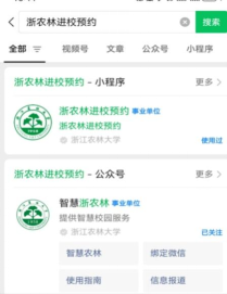 1.入口:1)微信搜“浙農(nóng)林進(jìn)校預(yù)約”;2)公眾號(hào)搜“智慧浙農(nóng)林”-微應(yīng)用-進(jìn)校預(yù)約。