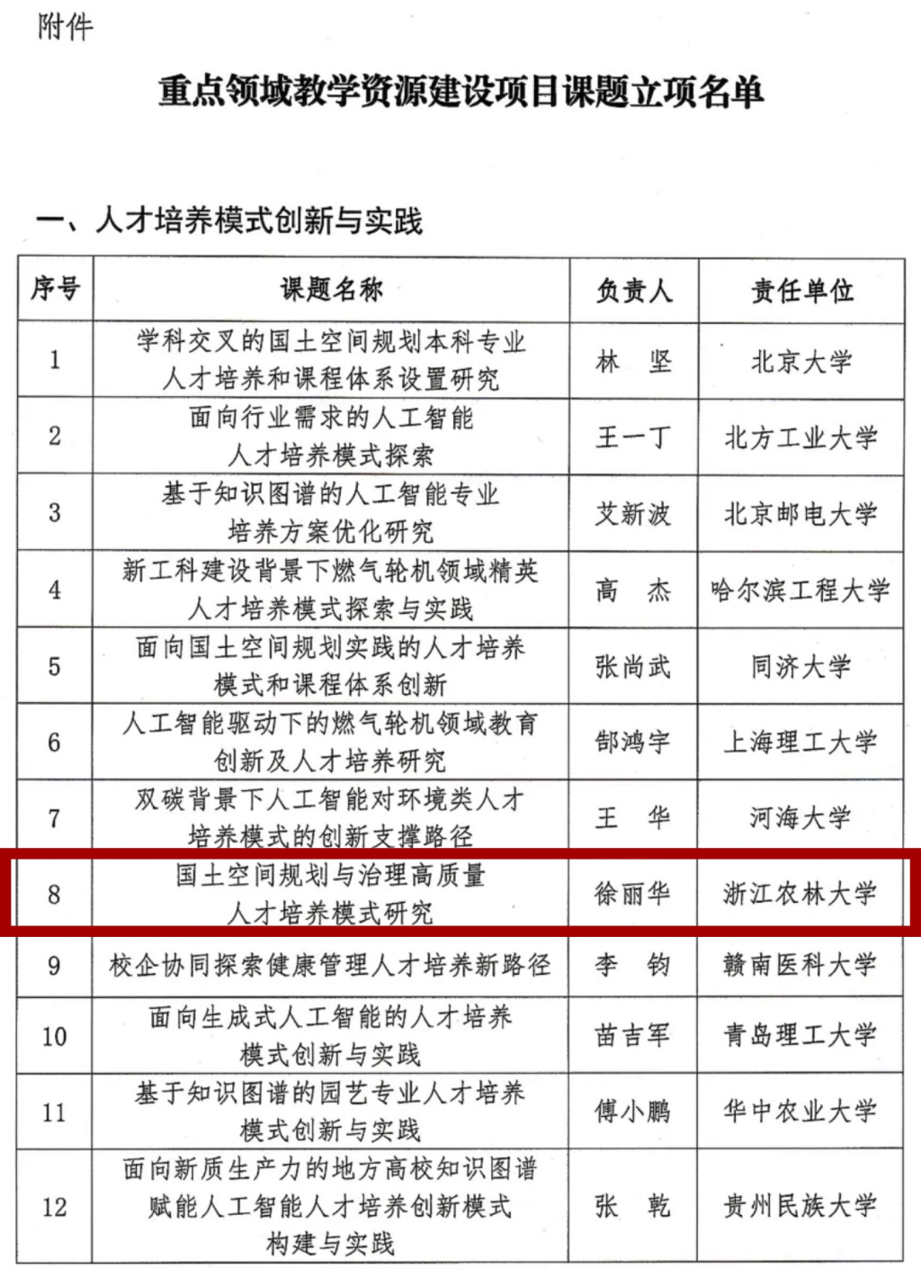 近日,教育部重點領域教學資源建設項目管理辦公室公布了重點領域教學資源建設項目課題立項名單,由園林學院徐麗華教授主持,城鄉規劃學科教師陸張維、吳亞琪、馬淇蔚、朱銓,風景園林學科教師唐慧超、陶一舟參與的《國土空間規劃與治理高質量人才培養模式研究》獲批人才培養模式創新與實踐類立項。課題的合作單位有浙江大學、嘉興國土空間規劃研究院。