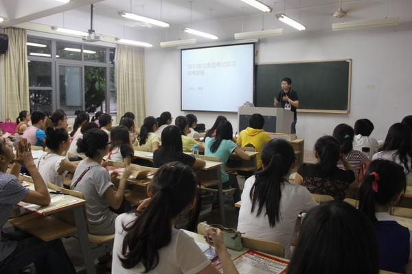 蔡楠從剖析廣大學(xué)生報(bào)考公務(wù)員的動(dòng)機(jī)引入講座主題,對(duì)于同學(xué)們存在的一些偏頗甚至錯(cuò)誤的報(bào)考認(rèn)知予以糾正。他全面剖析總結(jié)了2014年中央國家機(jī)關(guān)、浙江省公務(wù)員考試命題規(guī)律,對(duì)2015年的命題趨勢變化做了預(yù)測,并對(duì)備考時(shí)間安排、復(fù)習(xí)資料選擇及考試應(yīng)對(duì)策略做了講解。在互動(dòng)環(huán)節(jié),蔡楠用行政能力測試的部分考題問答調(diào)動(dòng)現(xiàn)場氣氛,激發(fā)同學(xué)們的興趣,用實(shí)例對(duì)行測的解題技巧做了闡述。