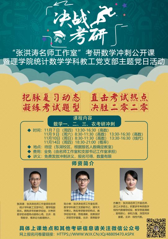 為了更好地服務我校考研同學,不忘教書育人初心,張洪濤名師工作室特傾力打造2020考研數學沖刺公開課程。課程將歷時3天:11月7日(周四)下午、11月9、10日(周六、周日)全天、11月14日(周四)晚上(詳情見海報),由理學院教師張洪濤、劉小林、方惠蘭共同授課。