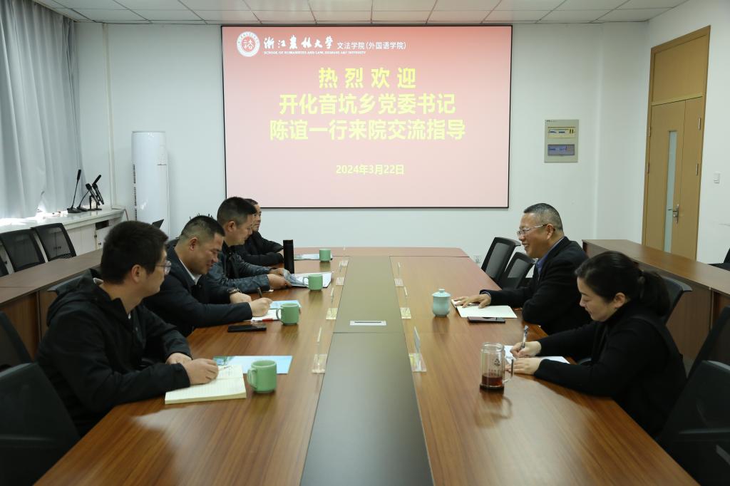 3月22日,開化縣音坑鄉黨委書記陳誼等一行來訪文法學院,就院地合作事宜進行深入洽談,學院院長魯可榮等學院領導出席并參加座談。